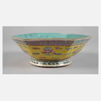 1. Hälfte 20. Jh., am Boden gestempelte Marke, facettierter Korpus aus Porzellan in polychromer Aufglasurbemalung, Wandung verziert von Ornamentik und Wolkenmotiven, die Innenseite türkis gefasst, hier Glasurriss, brandfleckig, am Stand minimal bestoßen, D ca. 20 cm.