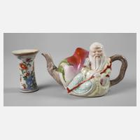China, 19./20. Jh., figürlich gestaltetes Kännchen, am Boden mit Pinselmarke, in farbiger Aufglasurbemalung, es zeigt den Gott der Langlebigkeit Shouxing mit übergroßer Kalebasse, dazu Väschen in Zylinderform mit ausschwingender Mündung, kobaltblaue Unter- und farbige Aufglasurbemalung, beide mit leichten Erhaltungsmängeln, H 9 und 11 cm.