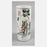 frühes 19. Jh., ungemarkt, signiert, zylindrischer Korpus aus Weißporzellan in polychromer Emaillebemalung und zarter Goldstaffage, Darstellung eines Gelehrten in Gartenlandschaft, etwas brandfleckig und berieben, H 28 cm.