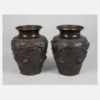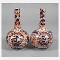wohl 18. Jh., ungemarkt, Porzellan in kobaltblauer Unter- und korallfarbener Aufglasurbemalung, kugelige Korpora mit hohen zylindrischen Hälsen, Front mit zentralen Medaillons, welche Ikebana zeigen, gerahmt von kleinteiligem Rankwerk und Ornamentdekor, Hälse gekürzt, etwas bestoßen, eine am Boden mit Glasurriss, H je ca. 27 cm.