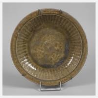 wohl 19. Jh. oder älter, ungemarkt, heller Scherben in grünlicher Glasur, gemuldetes Modell mit profilierter Fahne, Altersspuren und Craquelé, D 35 cm.