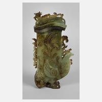 China, 20. Jh., aus hellgrüner, teils farbig staffierter Jade, aufwendig beschnitzt, stilisiert in Form eines Fabelwesens gestaltet, mit aufgelegtem Kuppeldeckel, winzigst bestoßen, Maße 29 x 17 x 5 cm.