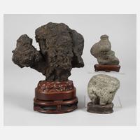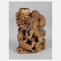 frühes 20. Jh., Speckstein aufwendig beschnitzt, teils farbig gefasst, ursprünglich als Lampenfuß fungierende Plastik mit Darstellung zweier im Kampf befindlicher Foo-Hunde, Altersspuren, H 22 cm.