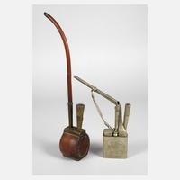 19. Jh., ungemarkt, Porzellan in kobaltblauer Unterglasurbemalung, kugelige Korpora, verziert von Landschaftsmotiven bzw. Ornamentik, ein Modell mit gedrechselter Holzmontierung und Durchbruch am Boden, umfunktioniert als Lampenfuß, brandfleckig, Altersspuren, H 23 und 26 cm.