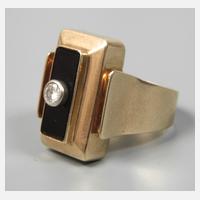 um 1950, Gelbgold gestempelt 585, ca. 21 mm hoher Ringkopf, besetzt mit Onyxplatte, hierauf Brillant von ca. 0,12 ct in Zargenfassung, minimale Tragespuren, RW ca. 18 mm, G ca. 9,6 g.