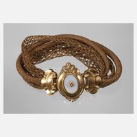 um 1820–30, Verschluss Metall vergoldet, besetzt mit einer weißlich-trüben Glasplatte, hieran fünf fein geflochtene Haarbänder, leichte Tragespuren, L max. 18,5 cm.