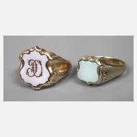1. Hälfte 20. Jh., Gelbgold geprüft 333/1000 und 585/1000, jeweils besetzt mit wappenförmigem Lagenstein, einer mit Gravur DO, leichte Tragespuren, RW ca. 20 und 22 mm, G gesamt ca. 9,5 g.