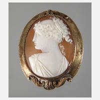 um 1860, Gelbgold geprüft 585/1000, besetzt mit einer fein geschnittenen Muschelkamee in Zargenfassung, Reparaturspuren und Tragespuren, Maße Brosche ca. 55 x 41 mm, G ca. 10 g.
