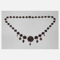 Ende 19. Jh., Tombak, umlaufend bestehend aus Schmuckgliedern und im Mittelteil sieben Abhängern, besetzt mit facettierten Granaten in verschiedenen Größen und Schliffformen (ein Stein fehlt), verziertes Kastenschloss, leichte Tragespuren, L ca. 48 cm.