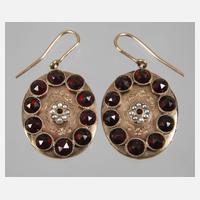 um 1880, Gold geprüft 333/1000, ovaler Abhänger besetzt mit jeweils elf Granatrosen und acht Saatperlen, rückseitig unfachmännische Lötstellen, leichte Tragespuren, L je ca. 39 mm, G gesamt ca. 9,4 g.