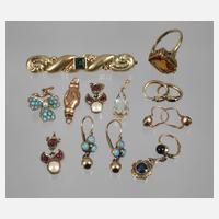 19./ 20. Jh., bestehend aus drei Paar Ohrringen, zwei Anhängern, einem Damenring, einer Brosche, einem einzelnen Ohrring, einer Handschließe und zwei Schmuckteilen, Gelbgold gestempelt 585/1000, G gesamt ca. 21,5 g und zwei Schmuckteile vergoldet, teils mit Steinen besetzt, unterschiedliche Erhaltung.