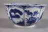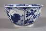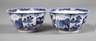 China, Jingdezhen, 20. Jh., tiefe Porzellanteeschalen im Kraak-Stil mit kobaltblauem Unterglasurdekor aus jeweils acht Bildkartuschen von blühenden Bäumen und Landschaftsszenen mit Gelehrten, im Zentrum Pfauenvogel und Päonienblüte, Rauten- und Blütenbordüre, apokryphe Sechszeichenmarke KANGXI, Provenience: Sammlung Günther Stelly, Berlin, je H 5,5 cm, D 10,5 cm.