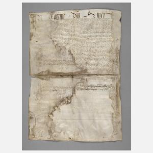 datiert 1510, in italienischer Sprache auf Pergament, stockfleckig, mit Wasserschaden, Schrift teilweise nicht mehr lesbar, Fehlstellen mittig und am Rand, Maße 26 x 35 cm.