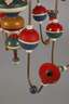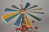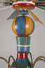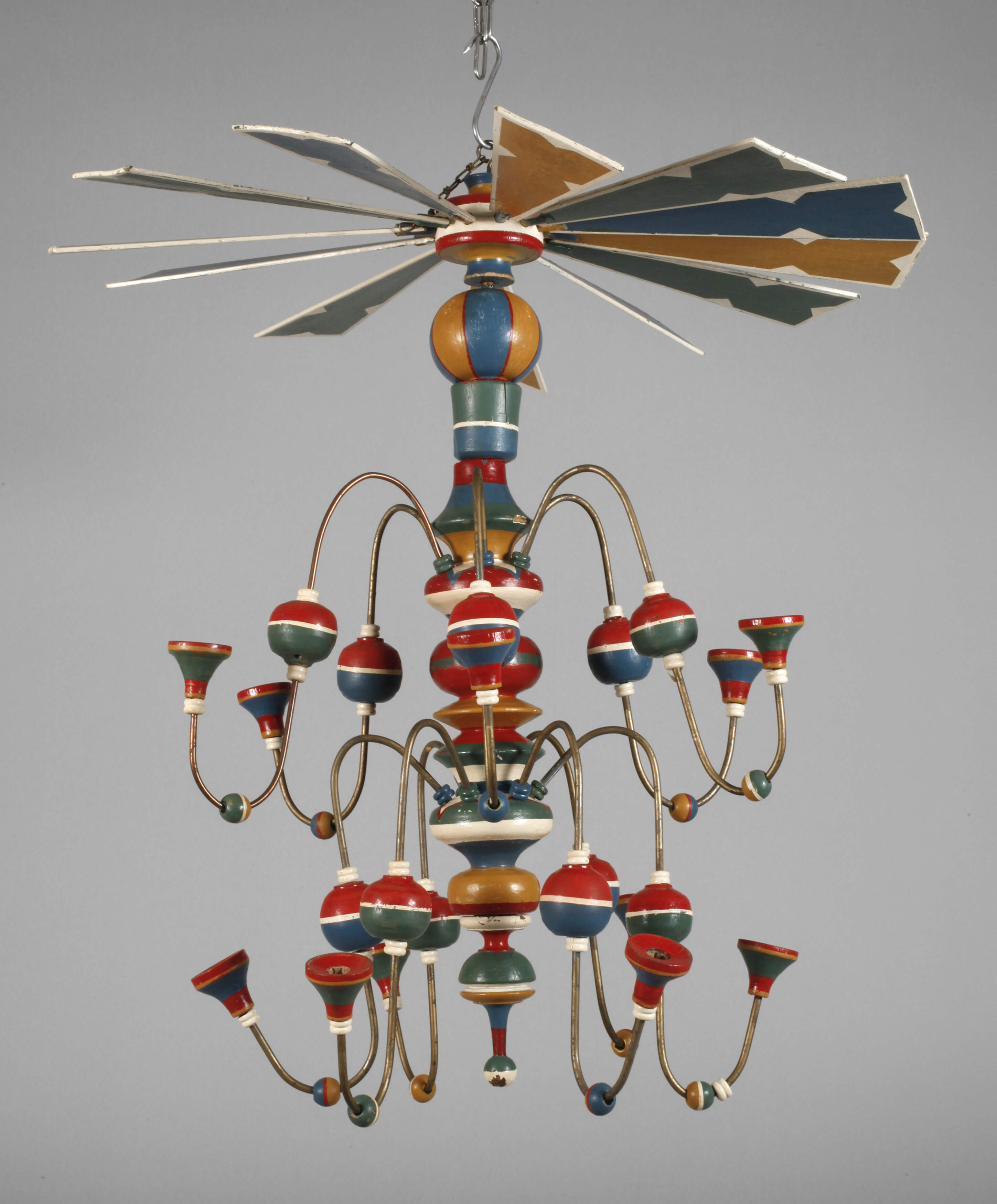 wohl um 1900, ungemarkt, Holz gedrechselt und farbenfroh gefasst, als steckbarer Hängeleuchter mit Balusterschaft, zwölf s-förmig gebogenen Drahtarmen mit Holzkugeln und zwölf Kerzentüllen, Balusterschaft um zwei Glieder und bekrönendes Flügelrad erweiterbar, Farbfassung alt übergangen und etwas restaurierungsbedürftig, L 45 bzw. 65 cm, D 60 cm.