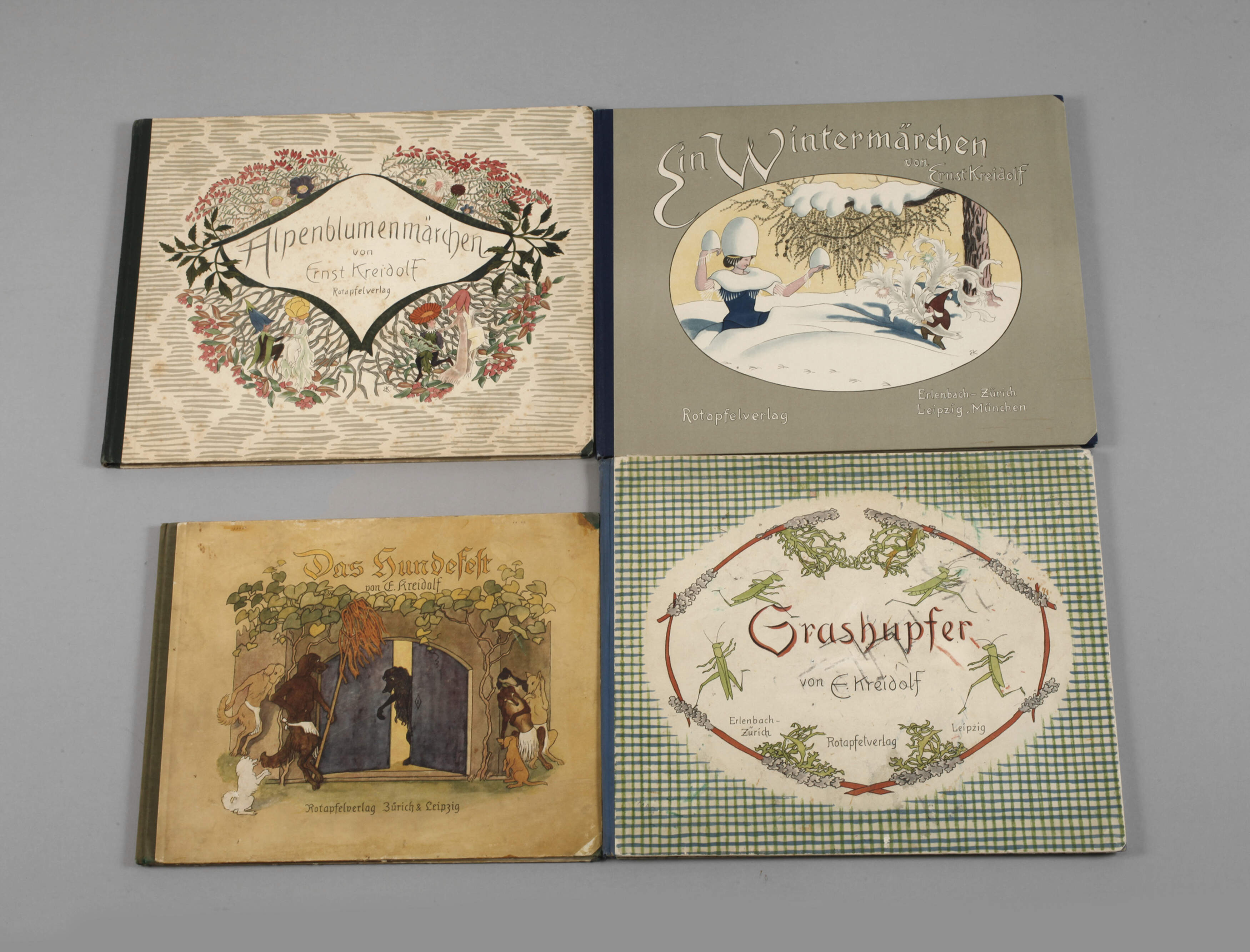vier Stück, 1920/30er Jahre, dabei Alpenblumenmärchen; Ein Wintermärchen und Das Hundefest, alle Erstauflagen; dazu Grashupfer, wohl 2. Auflage; alle Rotapfel Verlag Zürich/Leipzig 1922 bis 1931, mit zahlreichen ganzseitigen Illustrationen in Farboffset, Schmuckvorsatz, tlw. Schmutztitel und Verlagsanzeigen sowie originale Halbleineneinbände mit Farbillustration, einmal Schutzumschlag und zweimal Originalschuber, meist Querformat Lex. 8°, ein Schuber geklebt und ein Einband mit Kinderkritzelei, sonst guter Zustand mit unterschiedlichen Alters- und Gebrauchsspuren.