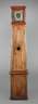 Anfang 19. Jh., Eiche massiv, dreiteiliges Gehäuse mit konisch zulaufendem Mittelteil, Tür mit kleinem Sichtfenster für das Pendel, quadratisches Ziffernblatt aus Messing mit Zinnauflagen in den Ecken, gravierte römische Ziffern, ausgesägte Stahlzeiger, Uhrwerk nicht komplett, restaurierungsbedürftig, Maße 225 x 49 x 25 cm.