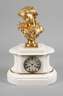 deutsch, 2. Hälfte 19. Jh., gemarkt Conrad Felsing, Königlicher Hofuhrmacher Berlin, die Büste signiert A. Pfeiffer, Gehäuse aus weißem Alabaster mit vergoldeten Zierleisten, die aufsitzende Büste eines Mädchen mit Vogel aus feuervergoldeter Bronze, feinst ziseliert, Ziffernblatt mit römischen Ziffern bezeichnet "Conrad Felsing Königlicher Hofuhrmacher Berlin", rundes Pendulenwerk mit Halbstundenschlag auf Glocke, ebenfalls bezeichnet "Conrad Felsing Schloss Freiheit No. 1 Berlin", eine Ecke des Gehäuses sauber geklebt, Werk funktionstüchtig, H 48 cm. Literatur: Abeler, Meister der Uhrmacherkunst, S. 179.