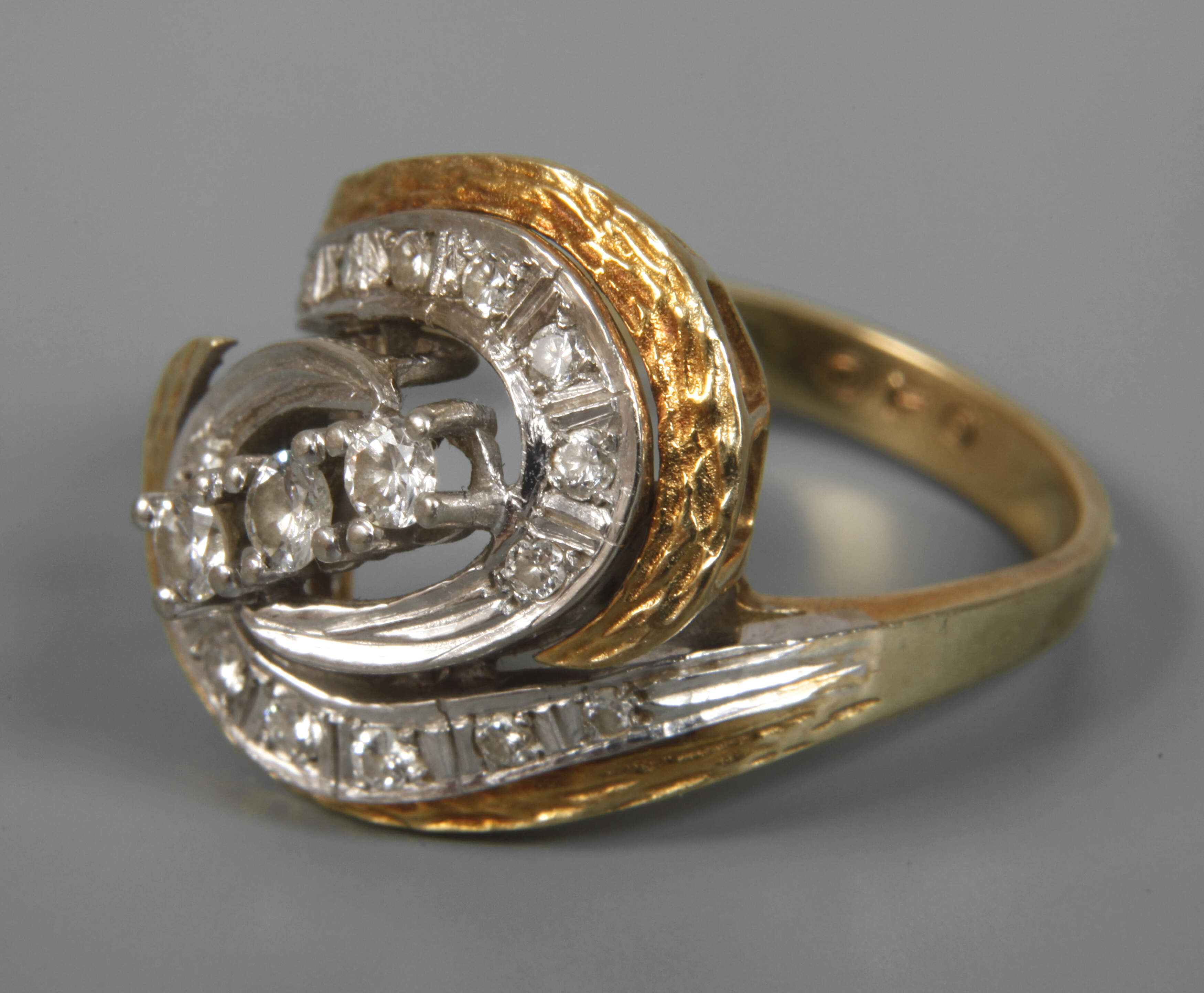 um 1960, Weiß- und Gelbgold geprüft 585/1000, spiralförmiger Ringkopf, besetzt mit drei Brillanten und 14 Kleinstbrillanten, leichte Tragespuren, RW ca. 17 mm, G ca. 5,6 g.