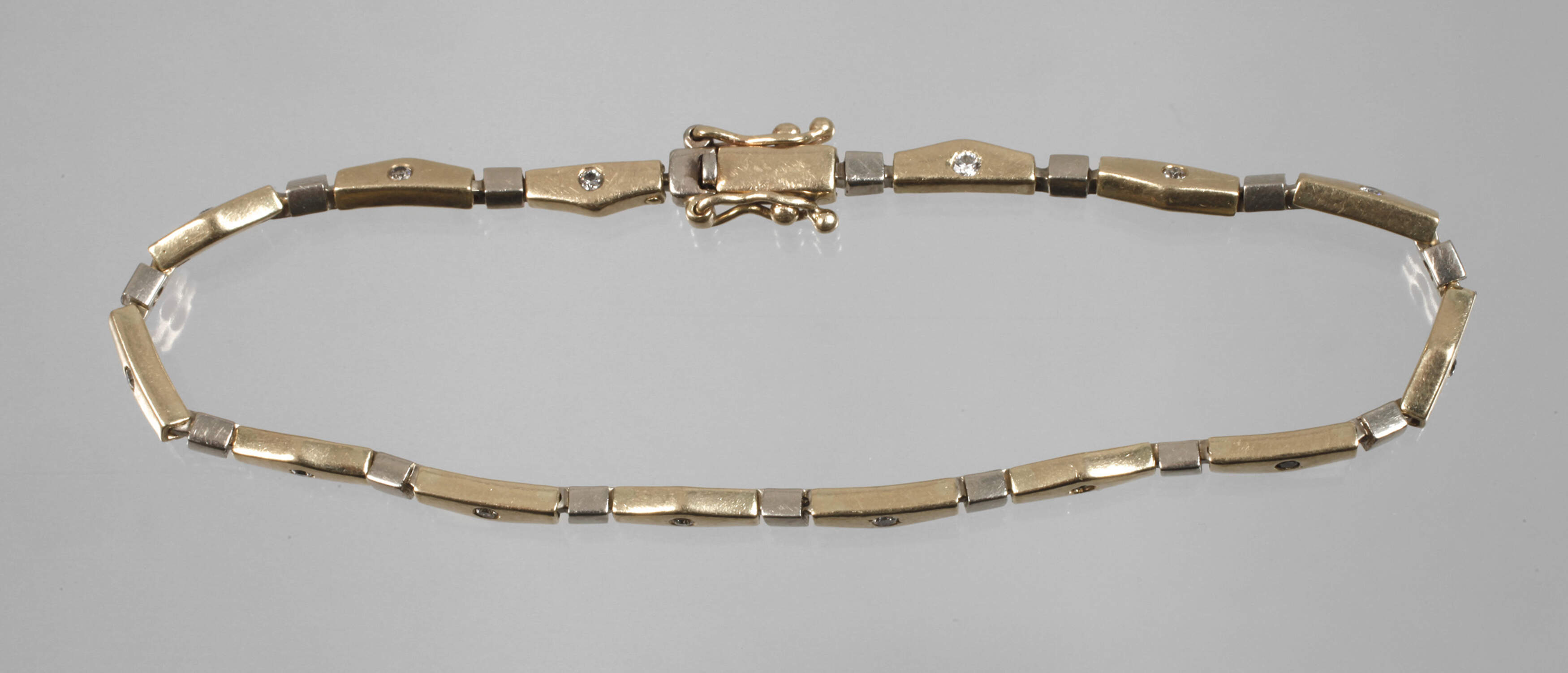 um 2000, Weiß- und Gelbgold gestempelt 585, besetzt mit 14 Brillanten im Gesamtgewicht von ca. 0,3 ct, Kastenschloss mit zwei Sicherheitsachten, Tragespuren, L ca. 20 cm, G ca. 11 g.