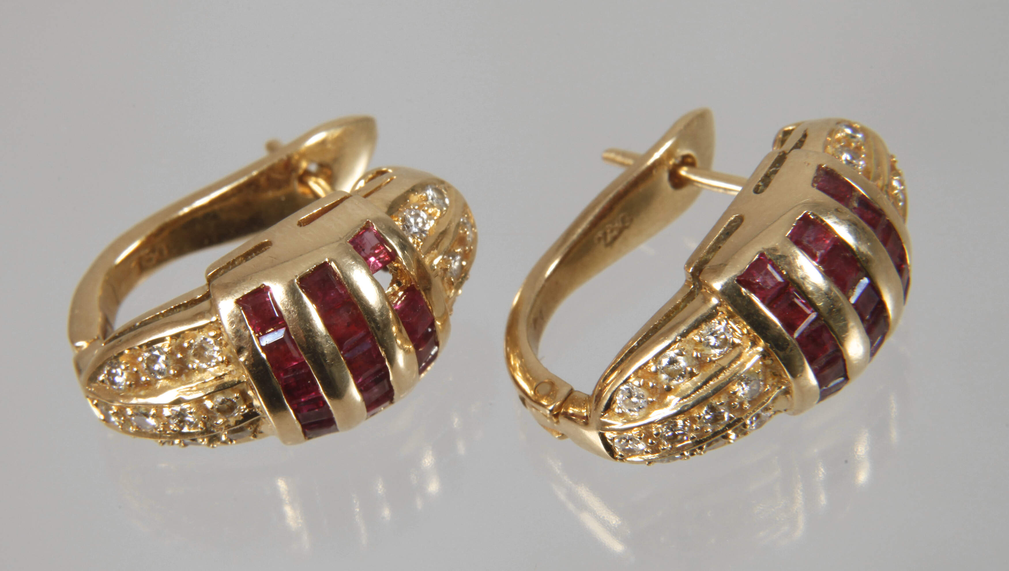 um 2000, Gelbgold gestempelt 750, jeweils besetzt mit 15 Rubinen in Kanalfassung sowie 16 Brillanten, leichte Tragespuren, L je ca. 19 mm, G gesamt ca. 8,3 g.