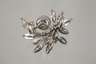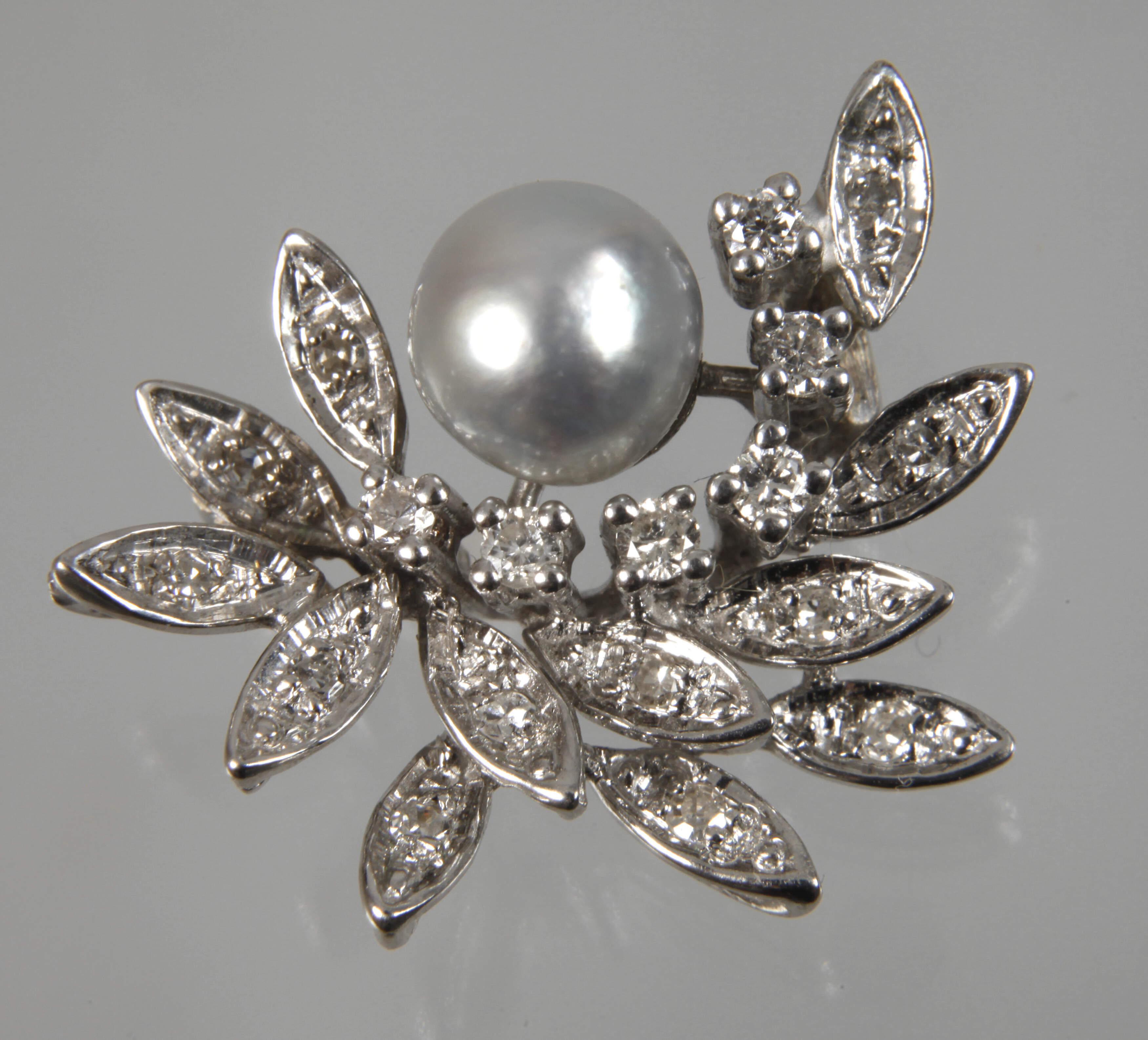 neuzeitlich, Weißgold geprüft 585/1000, in Form von stilisiertem Blattwerk und Blüten, besetzt mit einer hellgrauen Perle von D ca. 8 mm sowie 18 Brillanten von zusammen ca. 0,4 ct, Maße ca. 20 x 25 mm, G ca. 5,1 g.