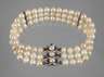 um 1970, Schließe Weißgold gestempelt 585, besetzt mit drei Zuchtperlen und sechs facettierten Saphiren, hieran dreireihiges Perlarmband, Perlen mit Wachstumsmerkmalen, leichte Tragespuren, L ca. 22 cm, G ca. 43,2 g.