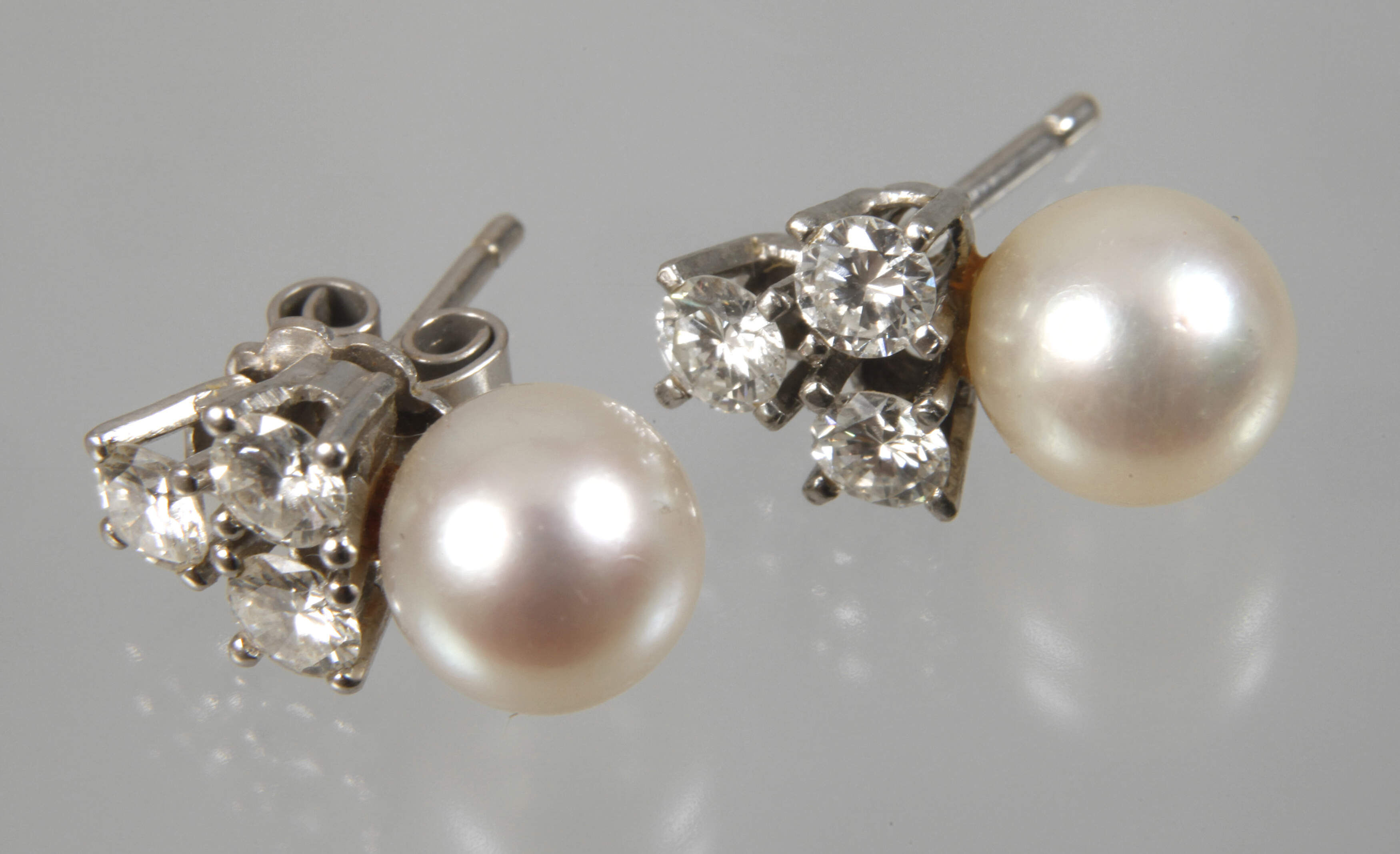 um 1990, Weißgold gestempelt 585, besetzt mit insgesamt 6 Brillanten von zusammen 0,6 ct sowie zwei Perlen von D ca. 8 mm, eine Schraube fehlt, Maße Ohrstecker je ca. 15 x 8 mm, G gesamt ca. 3,2 g.