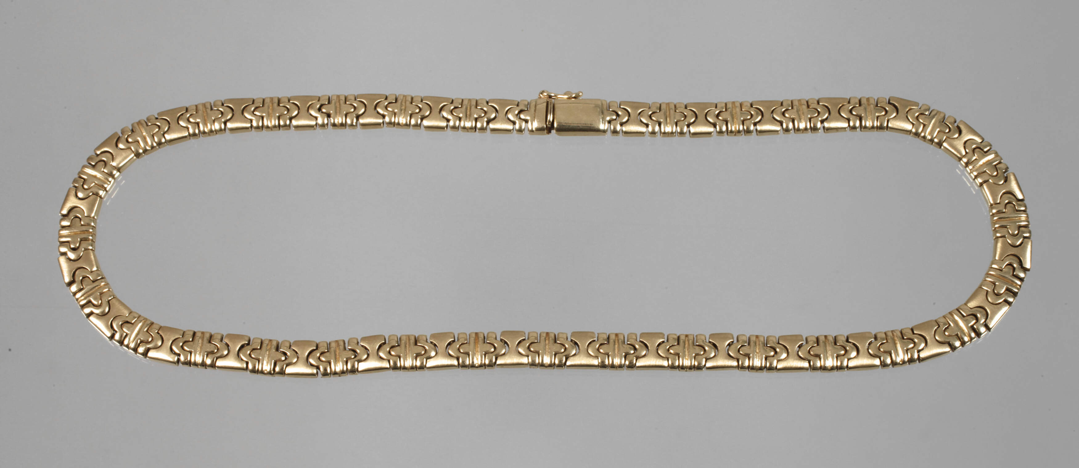 neuzeitlich, Gelbgold gestempelt 585 sowie Marke Cetas, ca. 7 mm breite, teils satinierte Glieder, Kastenschloss mit einer Sicherheitsacht, minimale Tragespuren, L ca. 42 cm, G ca. 49,7 g.