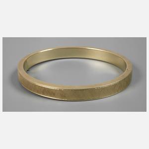 um 1980, Gelbgold gestempelt 585, flacher, ca. 8 mm breiter, teils ziselierter Reif, zum Öffnen mit verdecktem Kastenschloss und einer Sicherheitsacht, D max. ca. 63 mm, G ca. 26,4 g.