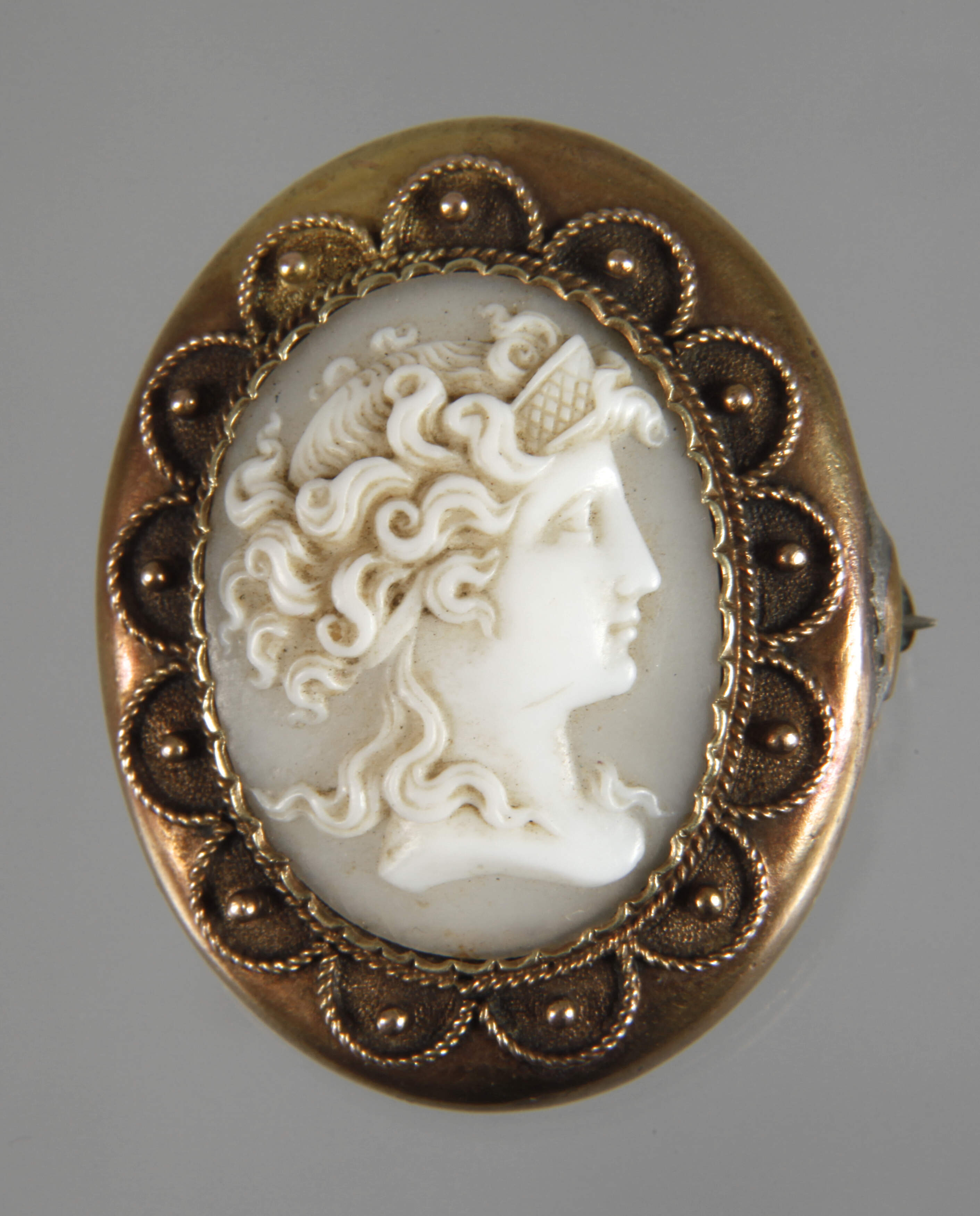 um 1860, Gelbgold geprüft 585/1000, besetzt mit plastisch geschnittener Muschelkamee in Zargenfassung, umgeben von Zierwerk aus kordiertem Draht, Tragespuren, Maße Brosche ca. 33 x 27 mm, G ca. 5,5 g.