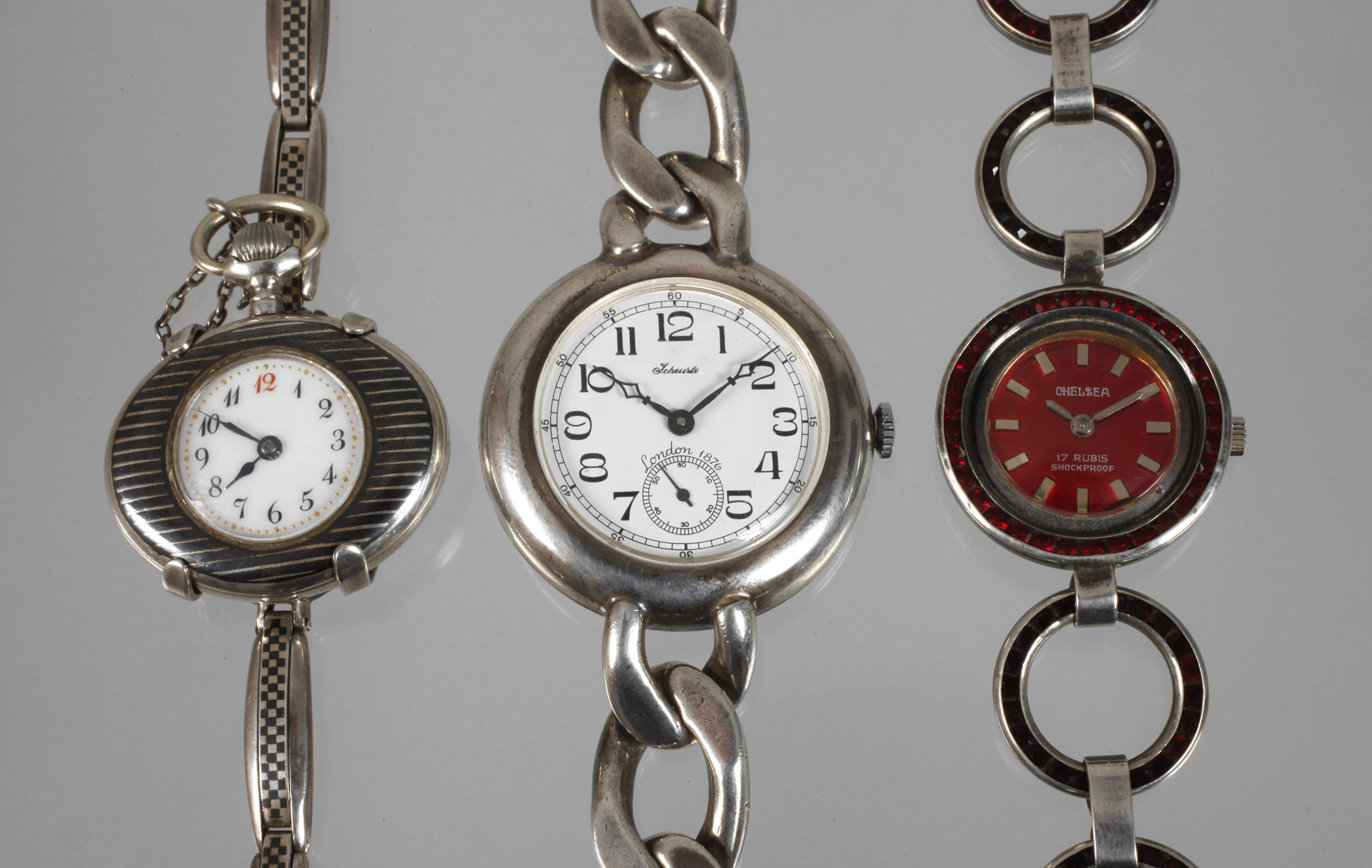 20. Jh., Silber gestempelt bzw. geprüft, zwei Uhren gemarkt Chelsea und Scheuerle, eine ovale Damenhängeuhr in Zweitverwendung (Band kein Silber), alle mechanischen Werke laufen an, leichte Tragespuren, L ca. max. 18,5 cm, G gesamt ca. 132,2 g.