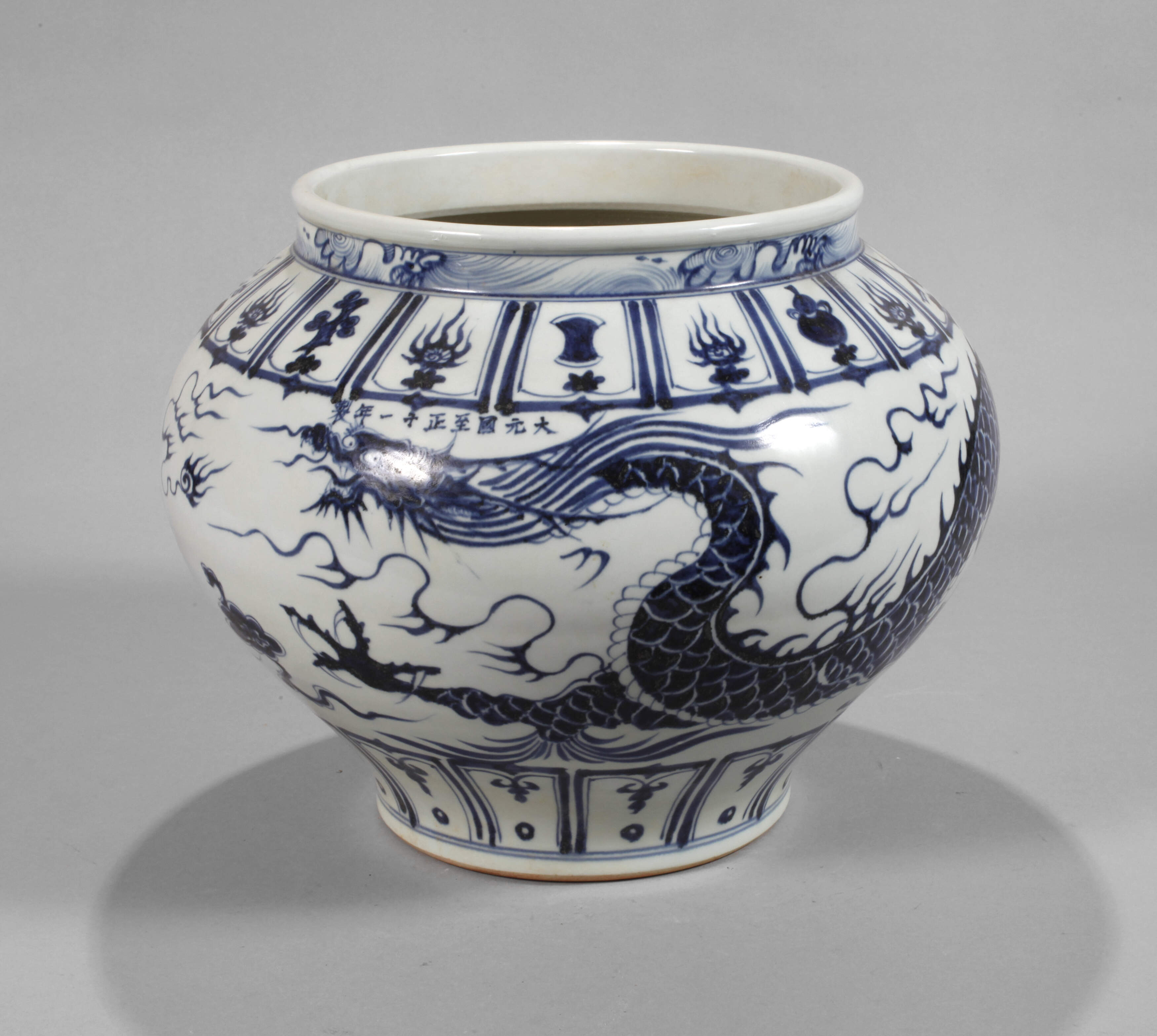 China, Jingdezhen, 20. Jh., Porzellan mit kobaltblauem Unterglasurdekor eines Drachens auf der Jagd nach einer flammenden Perle, obere Blütenbordüre mit glücksverheißenden Symbolen des Daoismus, Provenience: Sammlung Günther Stelly, Berlin, H 29 cm, D 41 cm.