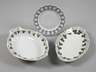 Formentwurf Ferdinand Selle 1902 bzw. Erich Kuithan 1908, grüne Stempelmarken 1901-1929, tlw. Pinselnummer, unterschiedliche Formen und Unterglasurdekore in Linien- und Schablonenmalerei, zwei ovale Schalen "Geschweifte Form/1902" mit grünem Dekor "Hopfen" und Brotteller "Gerippte Form/1908" mit blauem Dekor "Viktoria", flach gewölbte Schale haarrissig, die andere mit kleinem Brandfleck, sonst guter altersgemäßer Zustand, L Schale 25,5 und 26 cm, D Teller 16,5 cm.
