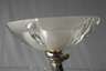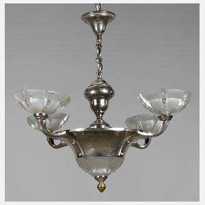 1930er Jahre, schweres verchromtes Modell mit gedrungenem zentralen Baluster, daran vier kurze geschwungene Leuchterarme, aufgesetzte Klarglasschirme sowie zentral eingesetzte Schale aus teilsatiniertem Studioglas, insgesamt fünfflammig elektrifiziert, gute Erhaltung mit normalen Altersspuren, H ca. 80 cm, D ca. 70 cm.