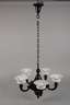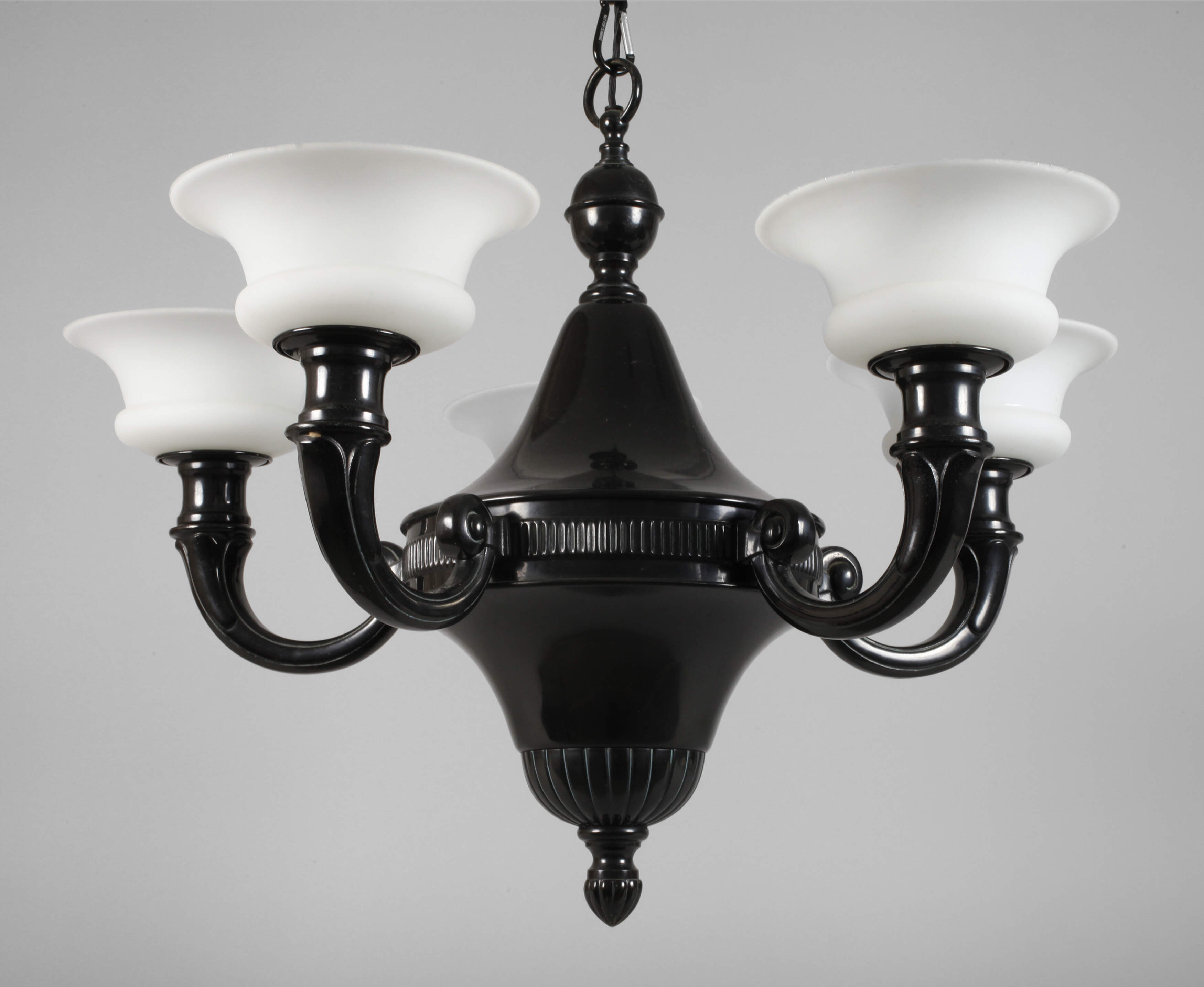 1920er Jahre, ungemarkt, Messing geschwärzt, an Gliederkette abgehängter Balusterkorpus mit fünf kurzen, c-förmigen Leuchterarmen, diese jeweils mit Lampenfassung und aufgesetztem Glockenschirm aus Alabaster, diese minimal bestoßen, sonst gute Erhaltung mit leichten Altersspuren, H ca. 140 cm, D ca. 70 cm.