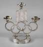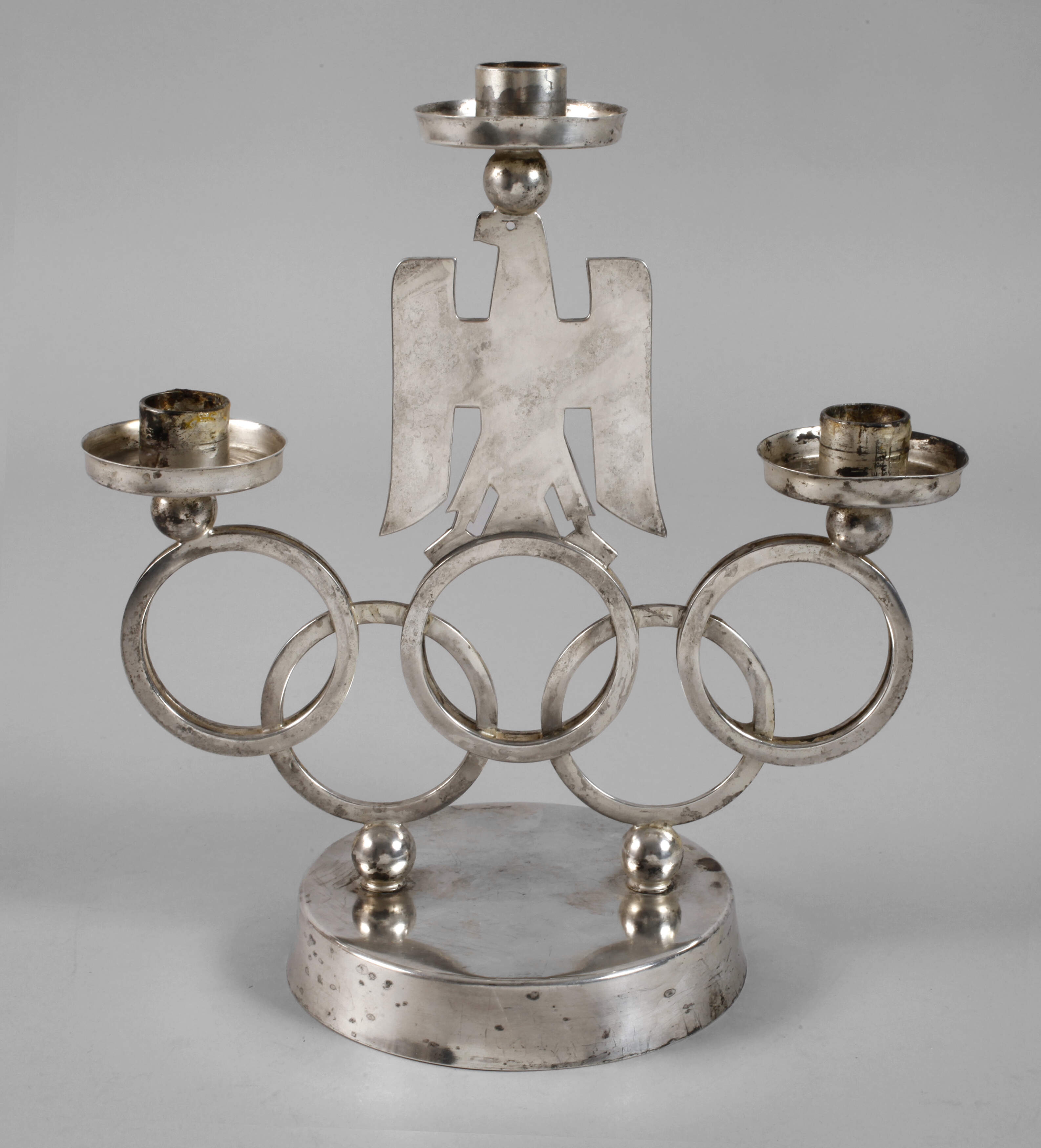 gestempelt EPNS, Herstellermarke Art. Krupp Berndorf, Alpacca versilbert, anlässlich der Olympischen Sommerspiele 1936, auf den olympischen Ringen und einem Reichsadler thronende feststehende Tüllen auf Kugeln, Alters- und Gebrauchsspuren, H 28 cm.