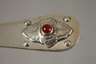 1979, Silber gestempelt Sterling Denmark, Herstellermarke Georg Jensen mit graviertem Schriftzug, mit geprägtem Datum 1904-1979, anlässlich des 75-jährigen Jubiläums, bestehend aus je einem Dessertlöffel, einer Dessertgabel und einem Dessertmesser, mit gerundeten Griffabschlüssen mit aufgelegter stilisierter Blüte, diese mit mittig eingesetztem Karneolcabochon, Hammerschlagdekor, Messerklinge aus rostfreiem Stahl, normale Gebrauchs- und Altersspuren, L max. 16,5 cm, G total ca. 139 g.