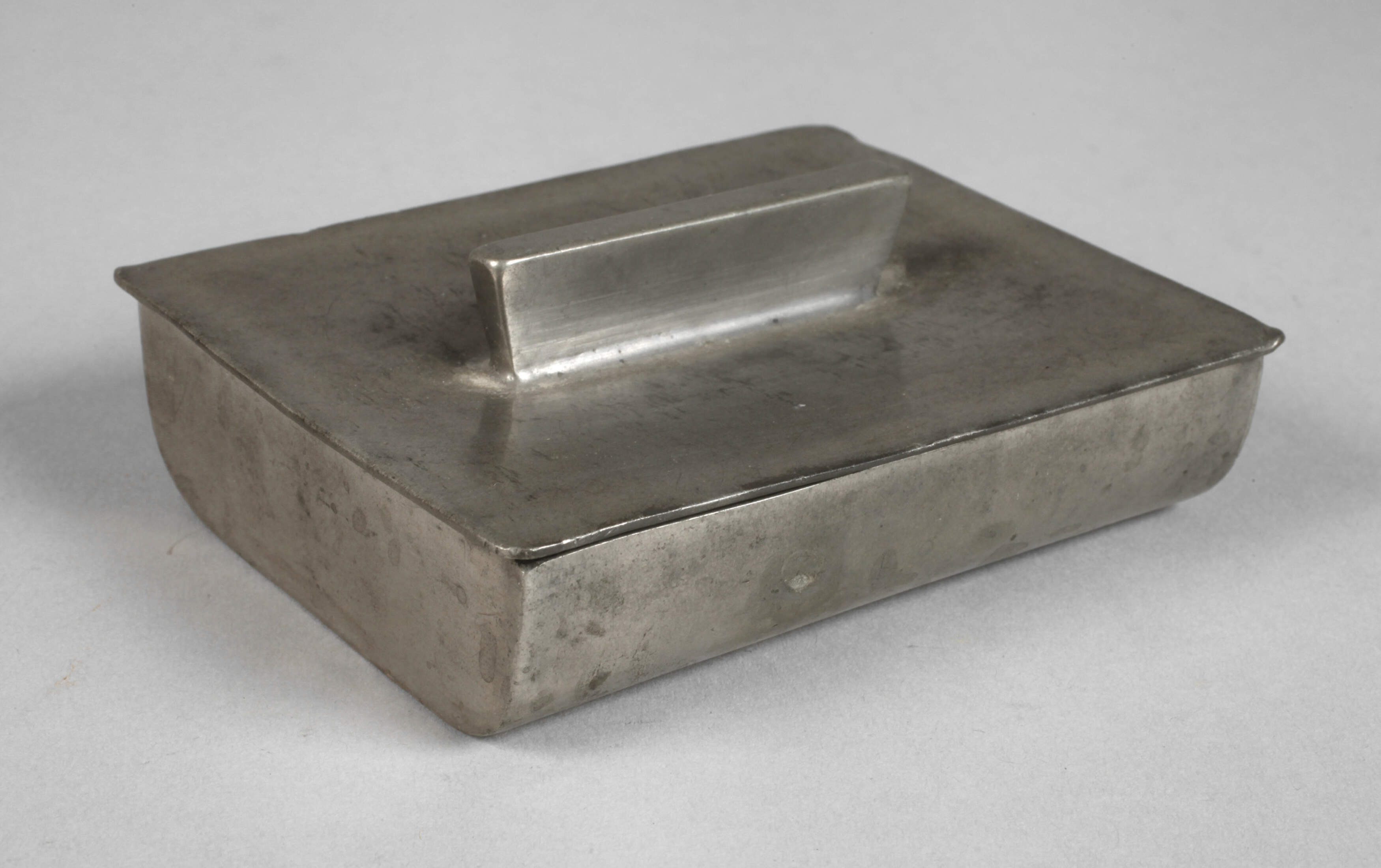 1930er Jahre, im Boden gestempelte Herstellermarke mit Schriftzug Urach, gestempelte Nummern 69 2, Zinn getrieben, nach oben gewölbter Korpus, seitlich mit gerader Wandung, abnehmbarer Deckel mit länglichem Griff, Alters- und Gebrauchsspuren, L 9,3 cm.
