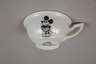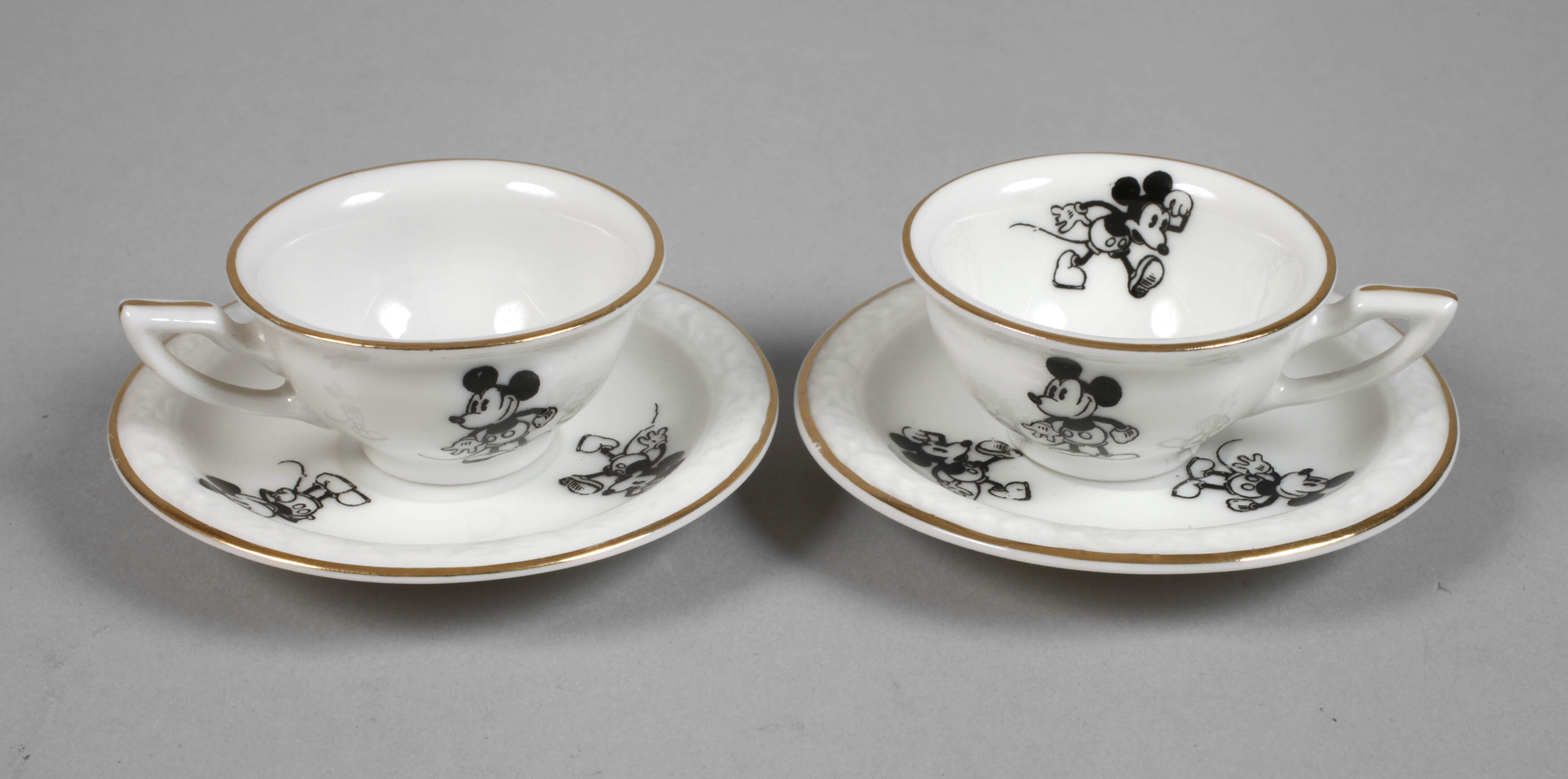 Formentwurf Philipp Rosenthal 1914, grüne Rosenmarke mit Zusatz Bavaria 1932, Form "Maria", dazugehörige Untertassen mit Reliefbordüre, jeweils schwarzer Aufglasurdekor aus drei unterschiedlichen Darstellungen der beliebten Walt Disney Comicfigur Mickey Mouse, Goldrand, selten, guter altersgemäßer Zustand, H komplett je 3 cm.