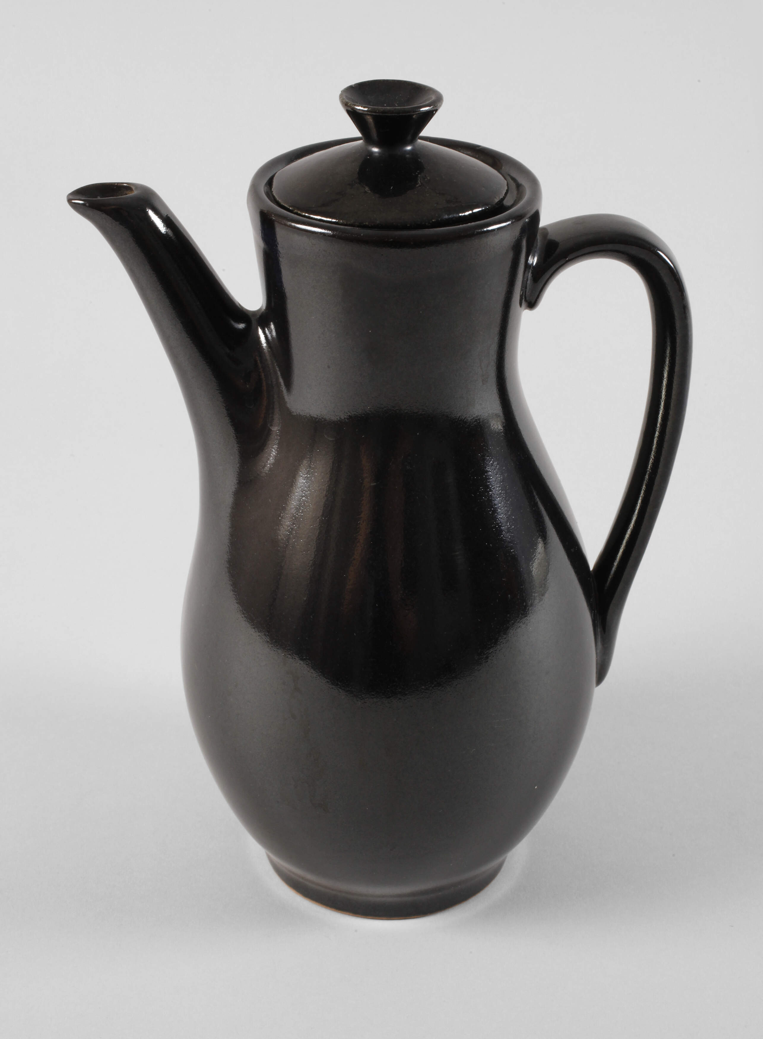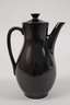 wohl 1930er Jahre, unsigniert, hellgraues Feinsteinzeug mit dunkelblauer, fast schwarzer Glasur, im Bauhausstil, gemuldeter Deckelknauf, dieser am Rand mit kleinem Chip, H 25 cm.
