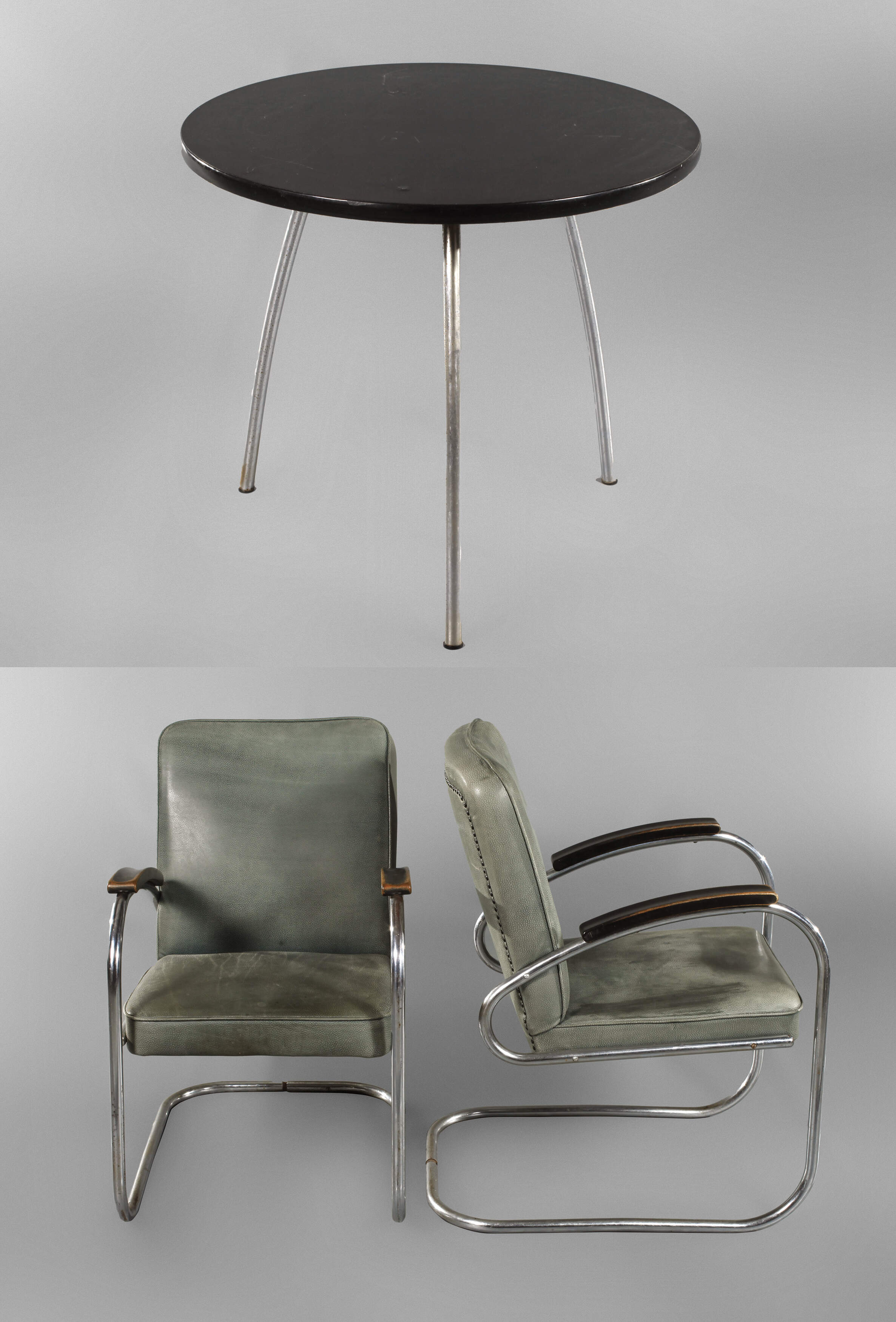 deutsch, 1950er Jahre, bestehend aus zwei Stahlrohrsesseln, Modell RS 7, und einem passenden runden Beistelltisch, die Sessel mit grünem Lederbezug und geschwärzten Armauflagen aus massiver Buche, der runde Beistelltisch mit originalem Herstelleretikett Mauser Werke Waldeck, guter Zustand mit Gebrauchsspuren, Maße Sessel 90 x 55 x 74 cm.