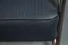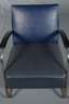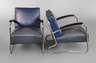 1950er Jahre, schwere Polstersessel mit aufwendig gebogenem Gestell, schwarz lackierte Armauflagen, originaler blauer Kunstlederbezug mit schwarzem Keder, Chrom Z 2-3, Maße 77 x 64 x 83 cm. Quelle: O. Macel, 2100 Metal Tubular Chairs, S. 176/177.