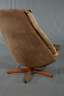 Modell 68, von Madsen & Schubell für Ib Madsen und Acton, Dänemark, 1960er Jahre, unter der Sitzfläche gemarkt, Drehgestell aus massivem Teakholz mit Kippfunktion, originaler brauner Wildlederbezug, die rautenförmig abgesteppten Polsterauflagen in hellbraunem Glattleder ausgeführt, Alters- und Gebrauchsspuren, Maße 92 x 77 x 85 cm.