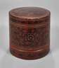 Myanmar, 19. Jh., Schwarzlack mit Rot- und Gelblackmalerei wirbelnden Rankenwerks auf einem feinen Rautennetzgrund, Tablettebenen im Inneren, Rand bestoßen, Provenience: Sammlung Günther Stelly, Berlin, H 17,5 cm, D 19 cm.