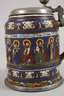 auf Schriftband datiert 1711, braunes salzglasiertes Steinzeug mit farbigen Emailledekor, schauseitig das Lamm Gottes, flankiert von den Aposteln, auf dem Schriftband darüber bezeichnet, Zinnmontierung bestehend aus Standring, Gurtfurche mit dünnem Band und übergreifendem Deckel mit eingelegter Plakette und Gravur "APM 1717 HLH", auf der Plakette Darstellung Carolus XII., Standring beschädigt und gerissen, der Krug an sich im sehr guten unbeschädigten Zustand, H 23 cm.