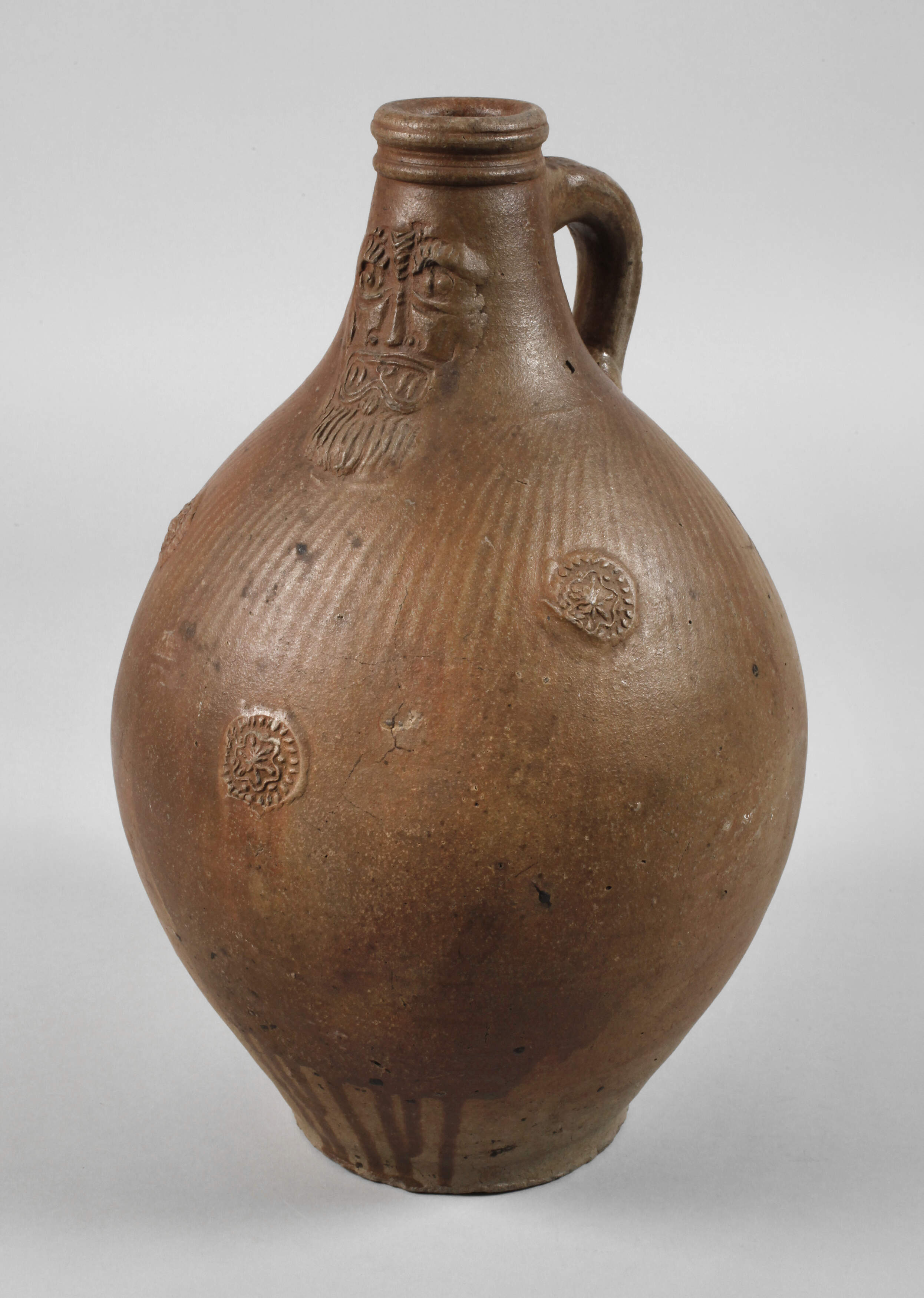 um 1700, graubraunes Steinzeug handabgedreht, birnenförmig, mit schräg gekämmter Wandung, fratzenartige Bartmaske und Rosettenauflagen, kurzer gerippter Henkel, haarrissig und kleine Fehlstellen, H 40 cm.
