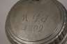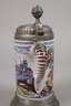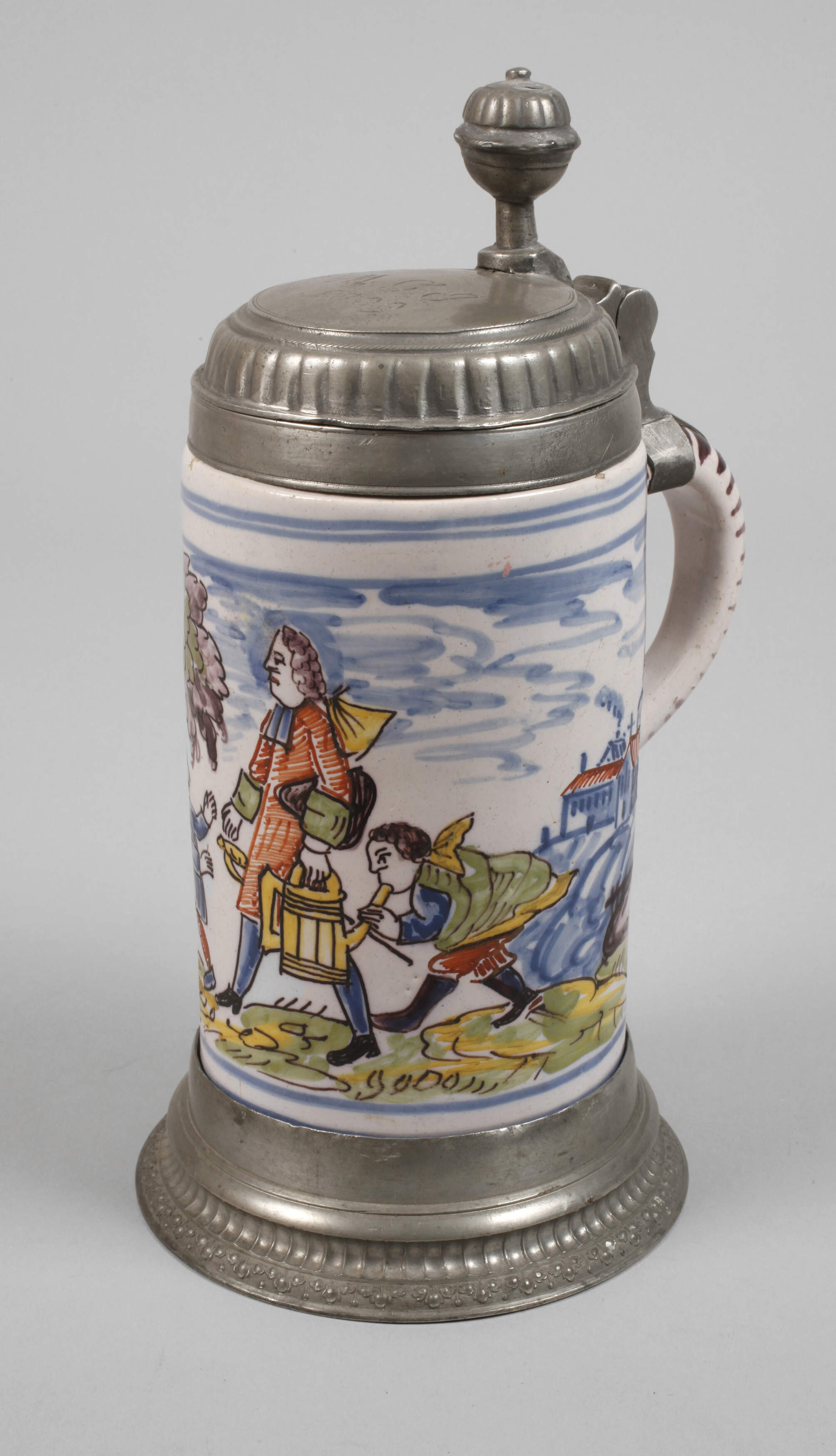 um 1800, monogrammiert "f", leicht rötlicher Fayencescherben mit weißlicher Glasur, bemalt mit bunten Scharffeuerfarben, Scherzszene mit Darstellung eines Rokokopaares vor einem Schloss, der Edelmann mit Kanne wird von zwei Jungen geneckt, Zinnmontierung bestehend aus übergreifendem godronierten Deckel mit Besitzermonogramm M.G.J., datiert 1809, hoher bandverzierter Standring, geringe Altersspuren, H 26 cm.