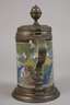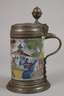 datiert 1729, Fayencescherben weißlich glasiert und mit bunten Scharffeuerfarben reich bemalt, Chinoiserien mit Tempel in Landschaft, weiter durchgebödeter Zinnstandring, breiter Lippenrand mit übergreifendem Deckel, dieser verziert mit eingelegter Plakette, graviertes Besitzermonogramm HM, innen ein größerer Glasurabplatzer, glasurrissig, mit stärkeren Altersspuren, Montierung reparaturbedürftig, H 28,5 cm.