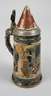 signiert, Entwurf Heinrich Schlitt, Ende 19. Jh., betitelt "Der durstige Ritter", Prägemarke V & B Mettlach, Schriftzug "gegen Nachbildung geschützt", Modellnummer 2382, grau eingefärbtes Feinsteinzeug, teilglasiert, geritzt, matt bemalt und vergoldet, verschiedene Ritterdarstellungen, zinngefasster Deckel mit Gravur "Preis Korso d. Radfahrer Vereins Stuttgart 4. Sept. 1898", Drücker als Nachtwächter, Henkel mit Tierköpfen und Wappenschild, Deckel nicht ganz passend, H 29,5 cm.