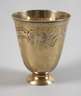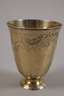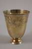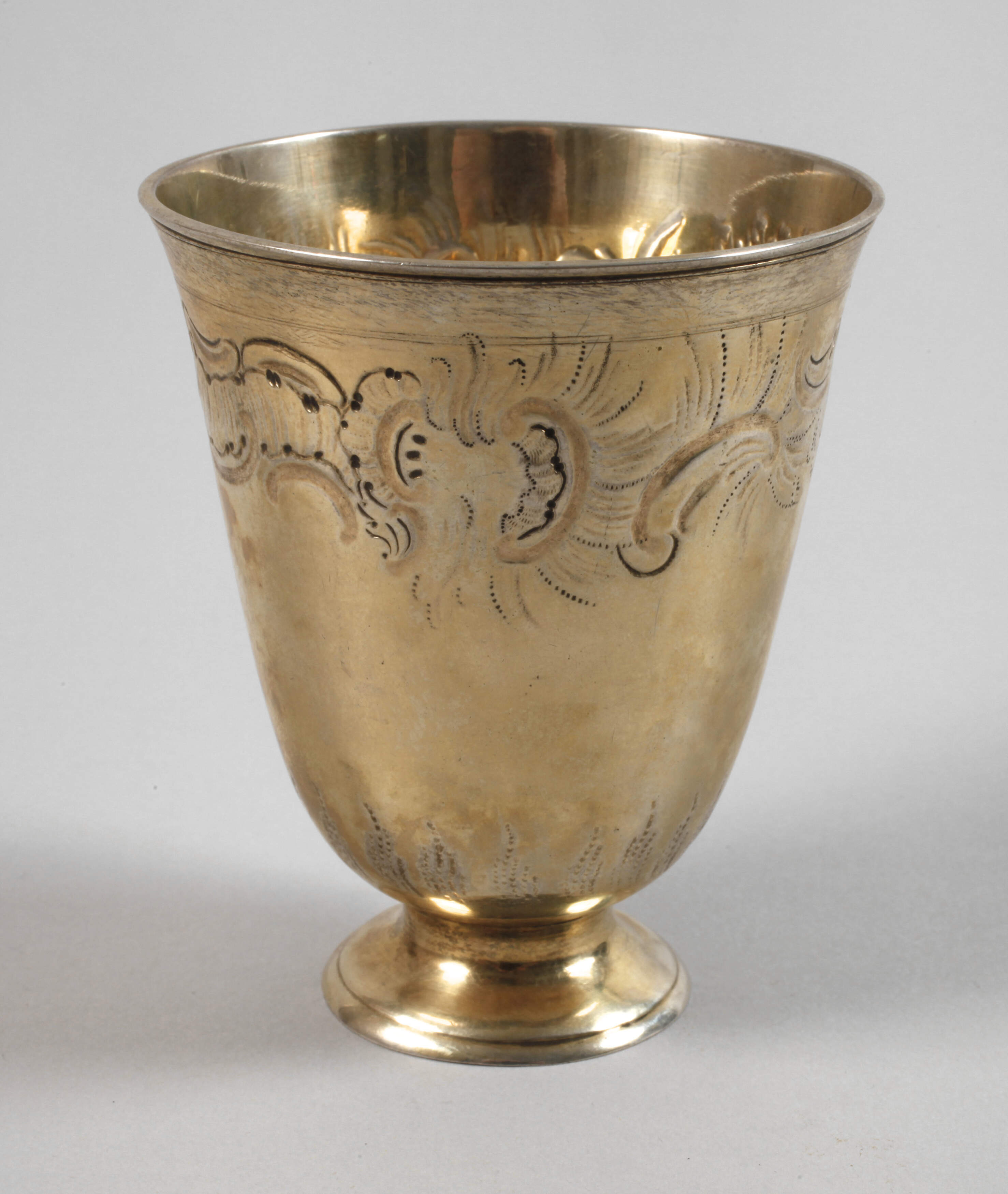 um 1760, Beschauzeichen Berliner Bär, Meisterzeichen IGH für Johann Gottfried Hildebrand (Meister um 1743), vergoldet, kleiner gefußter Becher mit leicht nach außen schwingender Wandung, diese verziert von getriebenen und gestichelten Rocaillen, Fuß von unten alt gelötet, Alters- und Gebrauchsspuren, H 9 cm, G ca. 83 g.